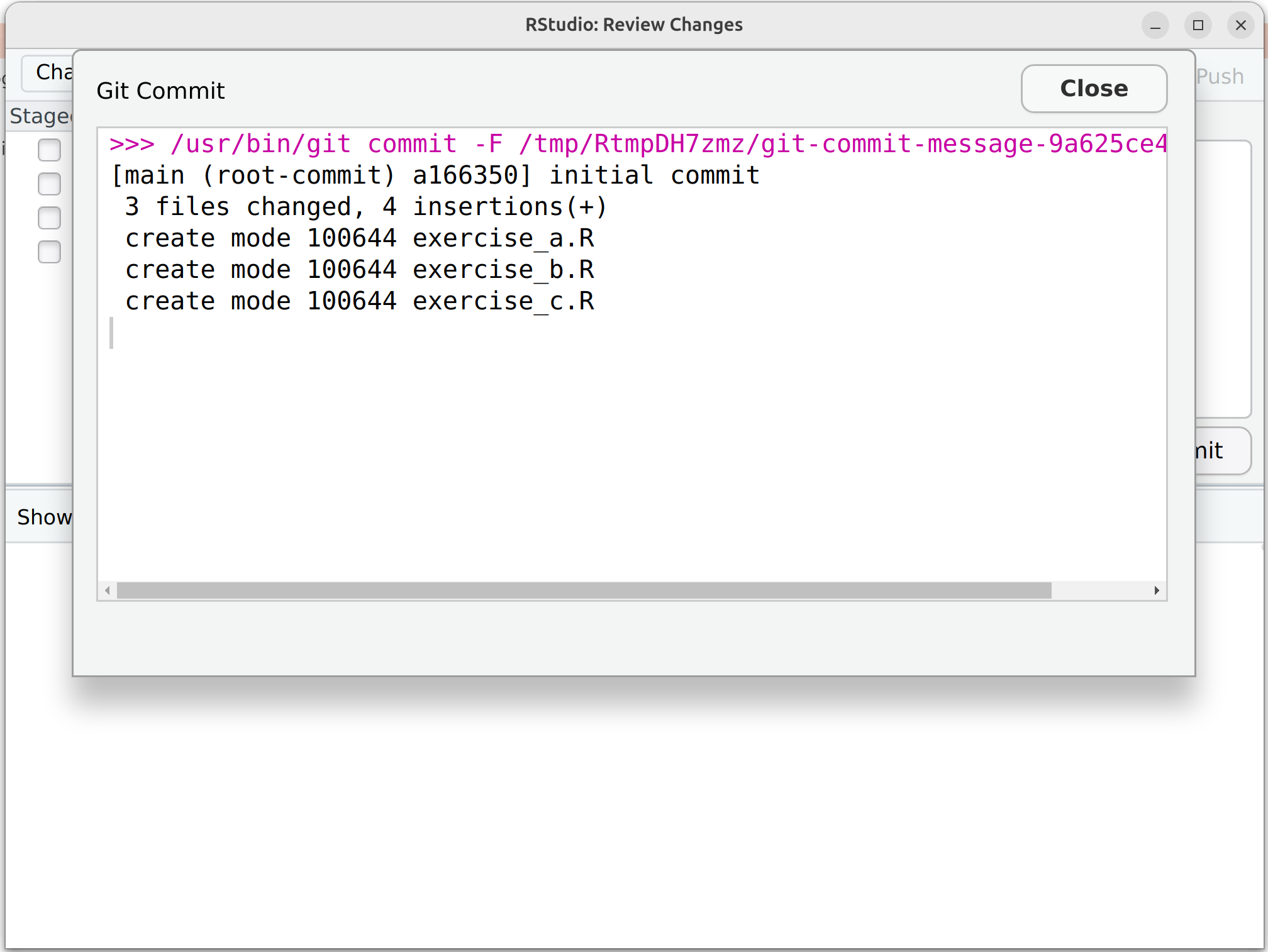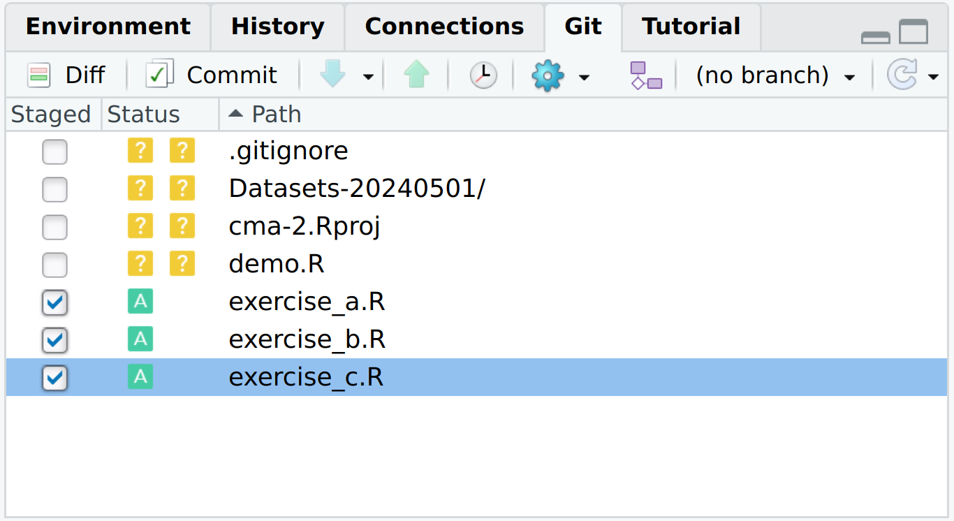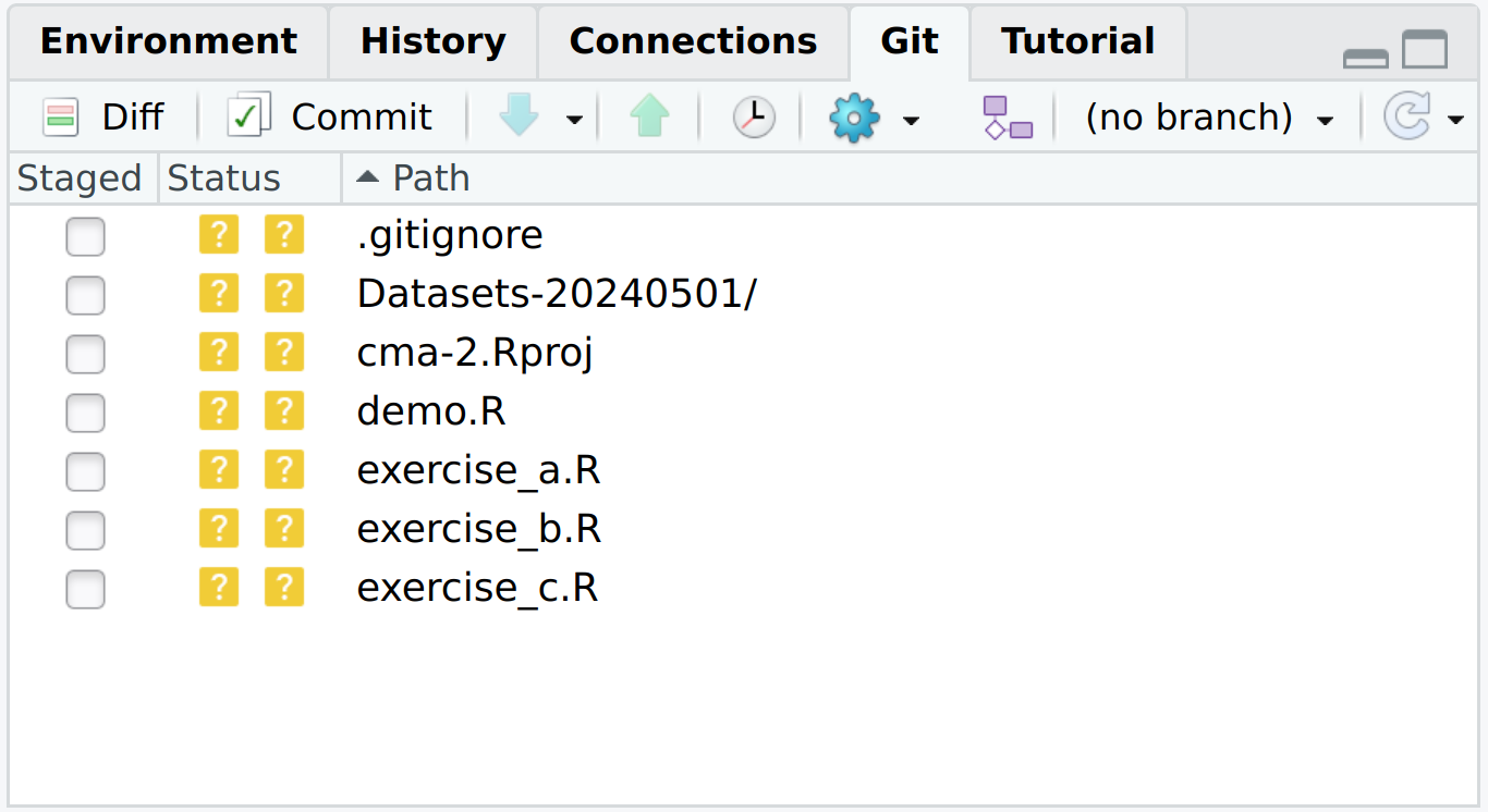 git add cma-2.Rproj # equivalent of clicking the checkboxNow refresh your git panel. You should see that the file cma-2.Rproj is selected (☑). You can commit the file with a commit message using the following command.