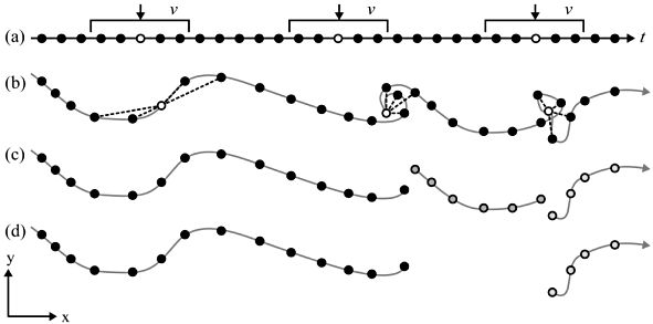 You’ve read Laube and Purves (2011) about segmenting trajectories. In the paper, the authors define “static” fixes as “those whose average Euclidean distance to other fixes inside a temporal window v is less than some threshold d”, as illustrated in Figure 16.1