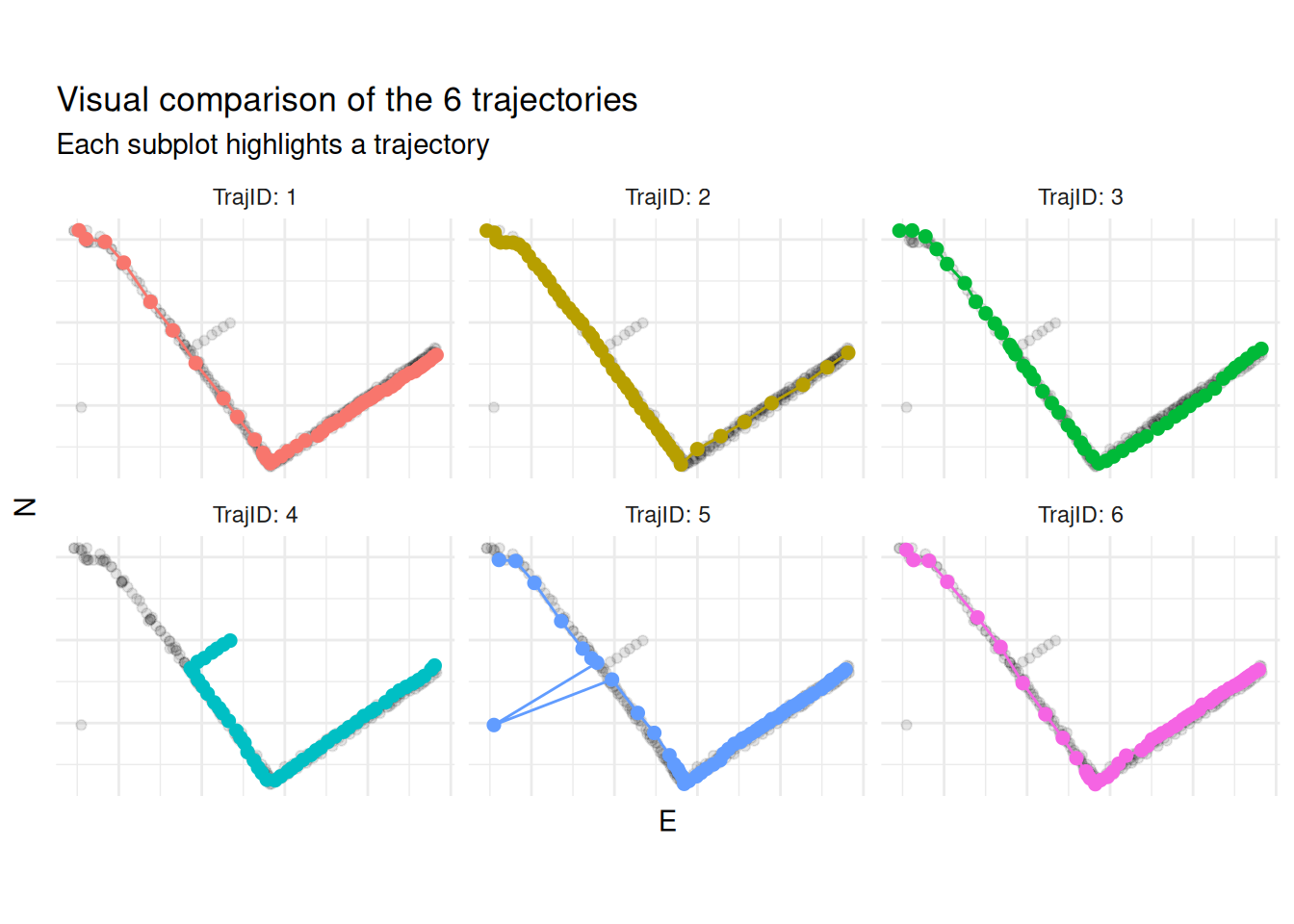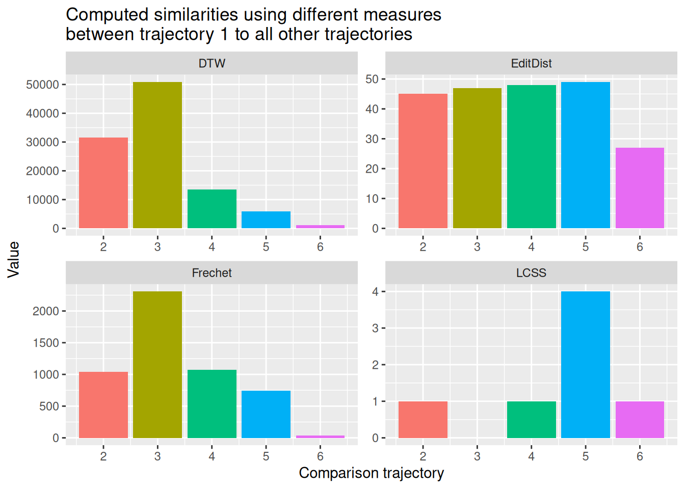 Install the package SimilarityMeasures (install.packages("SimilarityMeasures")). Familiarize yourself with this package by skimming through the function descriptions help(package = "SimilarityMeasures"). Now compare trajectory 1 to trajectories 2-6 using different similarity measures from the package. Your options are. DTW, EditDist, Frechet and LCSS.