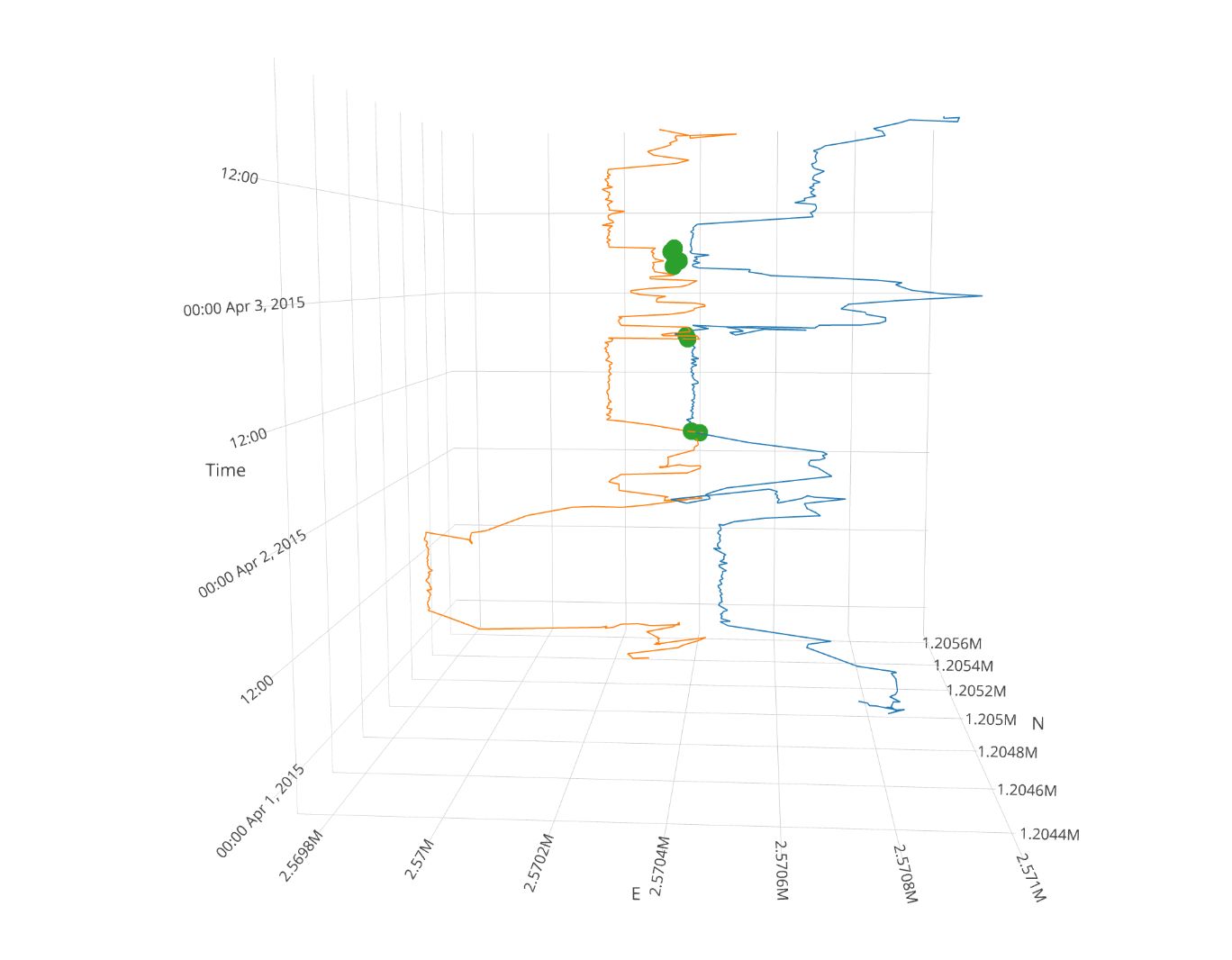 Finally, you can nicely visualize the meeting patterns and trajectories in a Space-Time-Cube (Hägerstraand 1970) with the package plotly. There are some nice ressources available online.