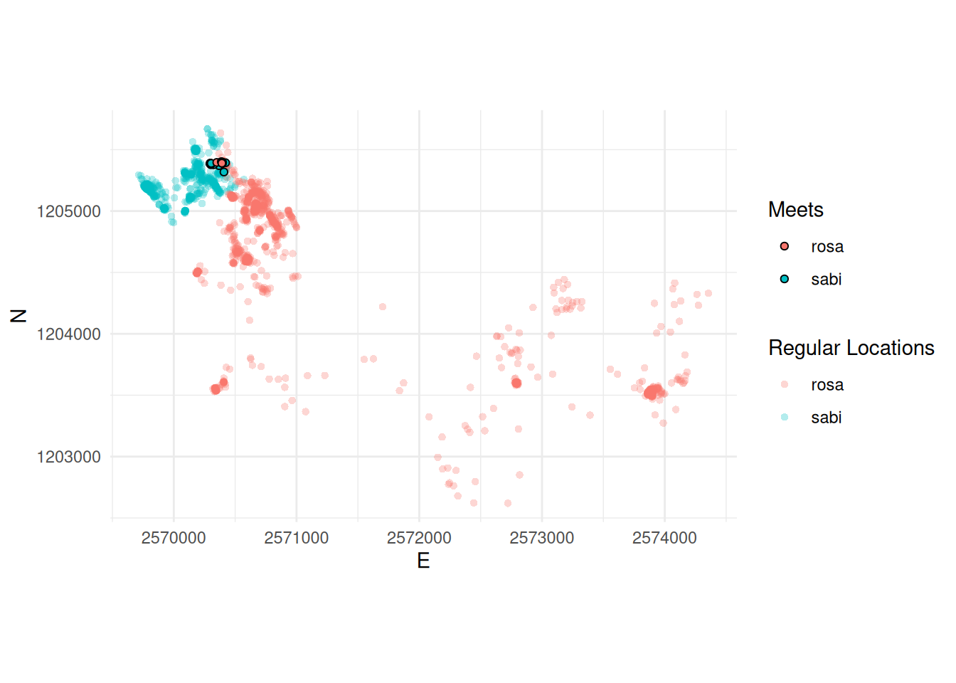 distanceto determine if the animals are also spatially close enough to constitute a meet (we use 100 meters). Store this Boolean information (TRUE/FALSE) in a new column