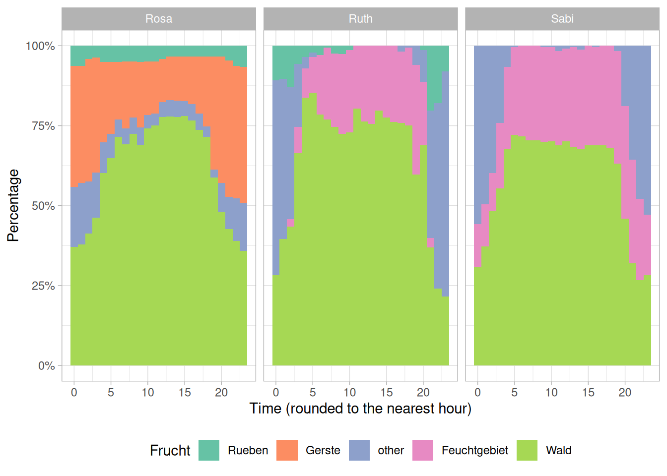 Think of ways you could visually explore the spatio-temporal patterns of wild boar in relation to the crops. In our example below we visualize the percentage of samples in a given crop per hour.