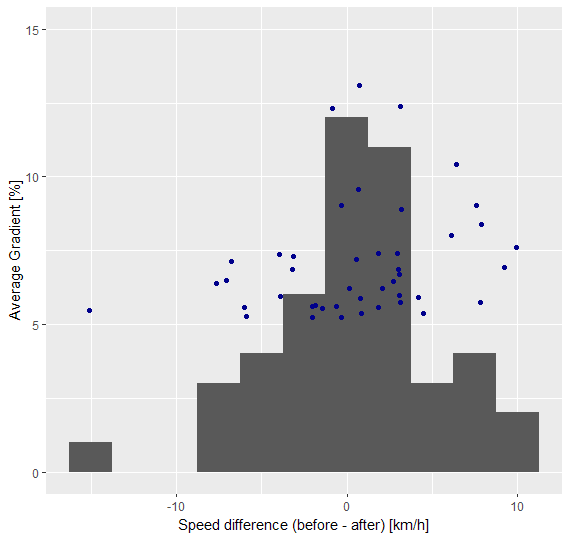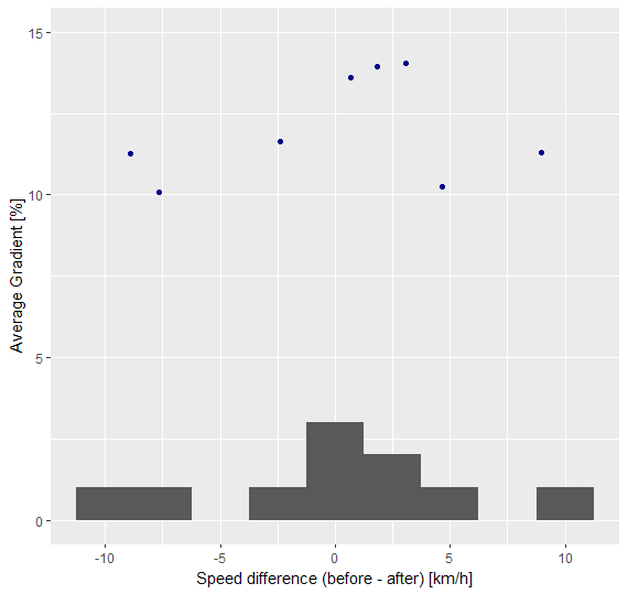 With multiple runs with varying steepness, there can be two conclusions. One is that the results are true and indicate that cyclists do not tend to slow down after a steep hill. The other is that the method is flawed and would have to be improved to draw a good conclusion from the results. Personally, I tend towards the second one. One key issue with the 10% methodology is that ‘flat’ segments would be including up to 10% gradient, which is certainly not true. There would have to be a separate function to determine flatness for the 10% case, which is not easily implemented with the function used here.